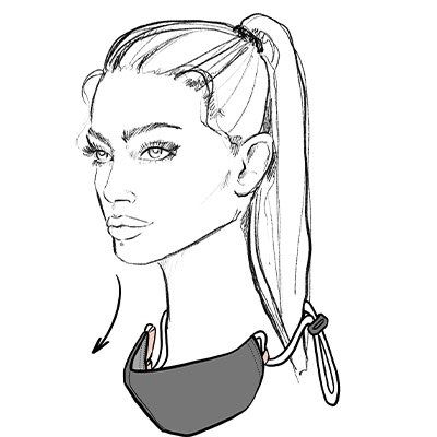 1. Lege Deine Maske vor Mund und Nase und führe die Gummibänder hinter Deinen Kopf.